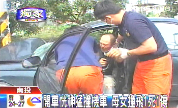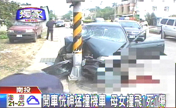 中新网3月4日电 据台湾TVBS报道,南投县草屯今天发生一起死亡车祸,轿车驾驶疑似恍神,直接撞上骑摩托车双载的母女,车被撞飞了10米远,坐在后座的妈妈虽然有戴安全帽,但因为摔下车时,被轿车撞上头部,当场伤重不治。