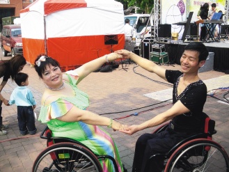 中新网4月6日电 据台湾《联合报》报道,台北市罹患小儿麻痹,重度肢障的梁春锦3年前罹患癌症,藉由练舞、瑜珈健身,也是小儿麻痹的丈夫苏俊源陪伴在侧并成舞伴,到处表演鼓励残障朋友。去年夫妻还到印度自助旅行1个月,创下坐轮椅到印度自助旅行的纪录。