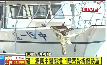中新网4月15日电 据台湾TVBS报道,南投日月潭15日上午起大雾,2艘载有大陆游客的游艇在雾中相撞,来自大连的旅行团中有4人受伤,另外还有2名台湾人受伤,其中有1人摔倒骨折,伤势较严重。