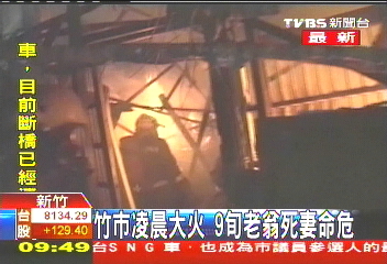 中新网4月26日电 据台湾TVBS报道,26日凌晨2点多,新竹市凌晨发生一起死亡火警!一对高龄90岁的蔡姓老翁和88岁的妻子,被人发现他们的房子陷入火海,立刻打119报警,消防局出动大批人力赶到现场抢救,但因为火势猛烈,老妇人全身90%以上二度灼伤,被送医急救,有生命危险,而有糖尿病被截肢坐在轮椅上的丈夫,因为逃生不及,不幸命丧火窟。