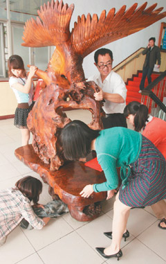 就在猫妈咪跳上窗台时,院检人员们听到躲在老鹰木雕座下方小猫咪瞇喵喵叫,望往窗台上猫妈咪悲怜眼神,大伙决定展开救猫行动,只见检察官、法官叔叔阿姨们,费尽力气搬起五吨重大木雕“救出来没,赶快……”。