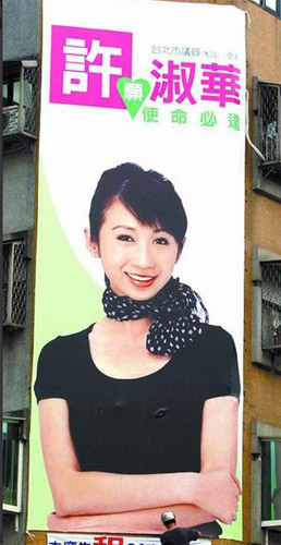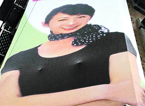 中新网5月19日电 据台湾《苹果日报》报道,台北市信义路、松仁路口的台北市议员许淑华竞选广告帆布广告牌,于20多天前设立,因当时晚上施工的人员未拆下帆布后方凸出铁条,导致广告上胸部位置有两点凸起,造成“激凸”效果。