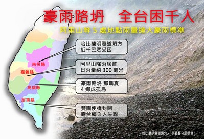 强大豪雨整夜下不停,阿里山单日雨量至昨天深夜11时已有297.5毫米,远远突破了250毫米警戒线,创“八八风灾”之后的最高。阿里山公路一旁山坡经不起连夜豪雨冲刷,土石松动冲到路面,将两线道路掩埋成一线道,还有出租车为了闪躲大石,左边轮胎不慎卡在水沟,动弹不得。