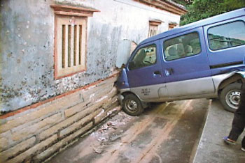 中新网5月27日电 据台湾《联合报》报道,金门金宁乡后湖32号这栋百年闽南古厝,25日傍晚遭一辆煞车失灵的工程车冲撞,一辆停在屋后的厢型车被撞飞,并把古厝撞破一个大洞,73岁的屋主许金水和65岁的薛含梨夫妇,当时正在客厅看电视,被突如其来的一撞吓了一跳,所幸没有受伤。
