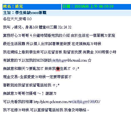 中新网6月7日电 据台湾“今日新闻”报道,岛内网络“援交”广告无孔不入,连高雄县教师会网站,也被一名自称20岁的“援交妹”在留言板贴了援交资讯,还留了自己的博客网址、大秀“清凉”照片,让高雄县教师会很无奈,因为删除后马上就有人会再PO上去,教师会呼吁看到的学生,千万不要被这些“援交”讯息给误导价值观。