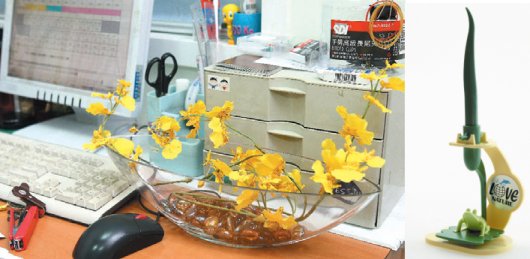 此外,还可在座位靠走道或邻近人往来走动的那一面,摆放会规律性旋转、摆动的对象,如点头娃娃,因为规律摆动的事物可让周围空气流转,气场流畅,做事也就会比较顺利,如果你是老板,甚至可以大方摆个流水球,更有气势。主管级的人,办公桌上或可摆放阵仗较大的流水。