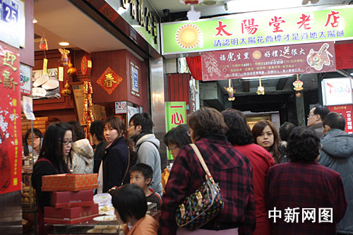 中新网台中2月22日电 (屈运栩)初到台中的人,一定会被路两旁零次栉比,目光应接不暇的“太阳堂”招牌和店铺吸引。店铺里售卖的太阳饼是台湾最有代表性的特产。春节刚过,记者走访了台中太阳饼老店铺最集中的自由路,看到各间老饼铺前都排起长队,一片生意兴隆景象。