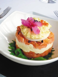 春秋乌来渡假酒店也在樱花季节推出樱花季套餐,用樱花入菜,像樱花烟熏鲑鱼塔,以烟熏鲑鱼加入洋葱碎、酸豆及日本四季红,中间夹入酸奶与奶油起司泥,酸甜可口,新推樱花甜点也很有特色。