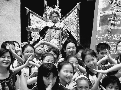 工作人员在旁讲解:马歇·马叟是法国默剧大师;莎士比亚是英国文艺复兴时期杰出的戏剧家和诗人;赵子龙是三国人物,这是赵子龙在京剧中的扮相,赵子龙是武生,扮相俊逸,身段威武稳健……三个人物配合讲解,摆出各种动作,小朋友们听得津津有味。“砰!”“赵子龙”身边的标示牌不知何故忽然倒下。一个小朋友立刻解释:“赵子龙不愧是武生,用气功就可以把牌子推倒!”此言一出,“赵子龙”都忍不住了,跟大家一起哈哈大笑。
