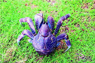 海管处指出,椰子蟹分布在印度、太平洋热带岛屿,是陆寄居蟹科中体型最大的,成蟹体重可达1至6公斤、头胸甲长15公分以上,因能以强而有力的螯脚剥开椰子外壳,取食椰肉而得名。