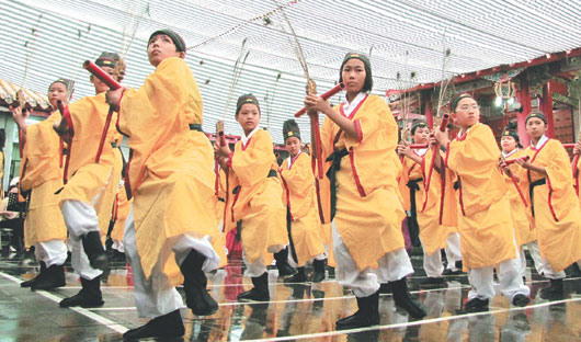中新网9月28日电 据台湾《联合报》报道,南投县各界纪念大成至圣先师孔子2559周年诞辰释奠大典,27日上午在埔里镇昭平宫育化堂孔庙举行,特别的是,担纲六佾舞“佾舞生”的育英小学首开县内先例,36名佾舞生中,小学六年级女生就占了19位。
