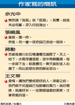 较少发短信的作家张晓风,昨天特别用短诗“用一昼一夜把自己活成一首诗”,示范短信该有的“简洁却深刻”,王文华赞美张晓风,生活俯拾都是诗,但多数人“把自己活成尸”,再次引来满堂笑声。