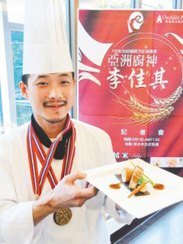 李佳其另外用猪肉当食材,以卤、炸、烤做成“怀旧新三味”,获得新亚洲风味料理金牌;另以香鱼、草虾、中卷等做成的“三冷三热展示开胃菜”拿铜牌。