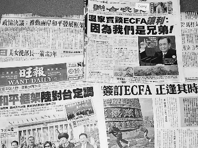 今天,此间“中央社”及时对全国人大闭幕及温家宝总理答记者问做出了详细报道。报道解释温家宝总理“兄弟虽有小忿,不废懿亲”这句话,是强调尽管兄弟之间存在分歧,但仍应以血缘关系为重,同心共御外侮。报道说,温家宝以兄弟喻两岸,意在表明大陆对两岸商签ECFA,愿意基于此而对台湾让利,在商签过程中,问题总是可以解决的。该社文章还特别提到温家宝在回答记者提问时说的平等协商、互利双赢、彼此照顾对方的关切三项原则,报道商签ECFA时大陆对台湾的让利将透过减免关税、早期收获来实现。