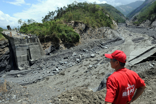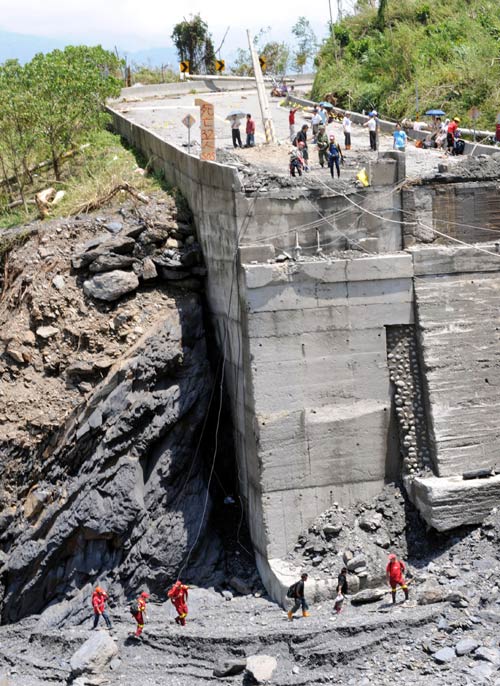 中新网8月13日电 据“中央社”报道,高雄县六龟乡荖浓溪上游堰塞湖13日泄流,部分搜救人员从荖浓溪涉水攀岩而上,途中险象环生。