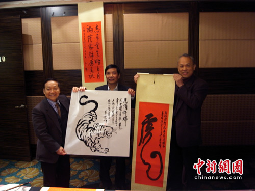 上海闵行区政协主席吴申耀(中)近日率团访台进行文化交流,与台湾书画家秦仲璋(左)、台湾微雕书法家陈逢显(右)互赠书画作品