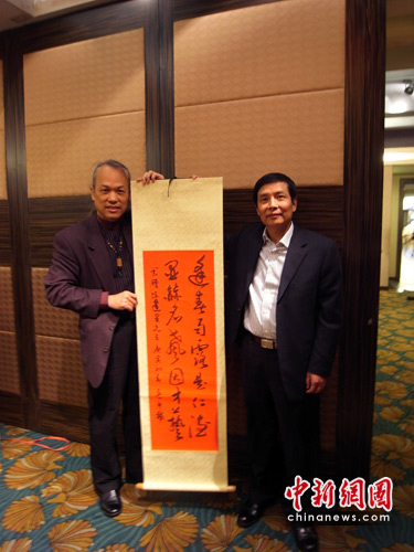 上海市闵行区政协主席吴申耀(右)与台湾微雕书法家陈逢显互赠书法作品