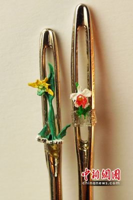 中新网4月30日电 为庆贺台北举办花卉博览会,台湾著名微雕家陈逢显以一个月完成一件世界最小兰花作品,长0.25公分,宽0.15公分,兰花作品材质为树脂,有两株嘉德丽亚兰花,一株是大白花红心,另一株是大黄花绿心。