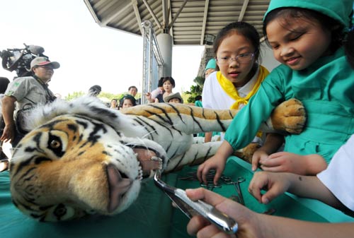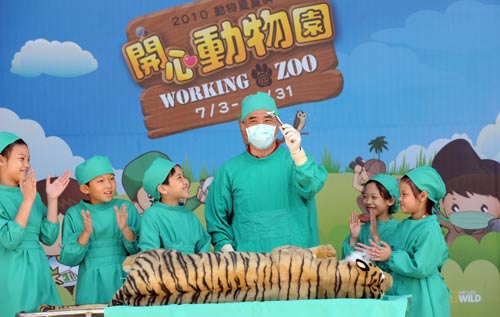 台北市立动物园27日举行“开心动物园Working@zoo”活动,小朋友们变装成兽医,体验为老虎治疗牙痛的经验 (图片来源:台湾“中央社”)