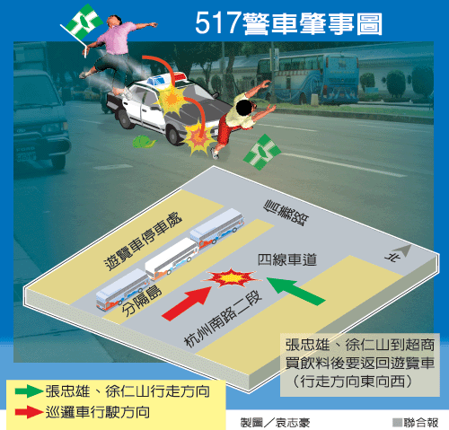 张忠雄、徐仁山在跨越杭州南路车道时,突遭同由杭州南路南向北行驶的巡逻车撞上,张忠雄被撞后弹落到巡逻车挡风玻璃上,再滚落地面。由于撞击力大,巡逻车的挡风玻璃碎裂,原本行驶在内侧第二车道的巡逻车,也偏向最内车道紧急煞车。