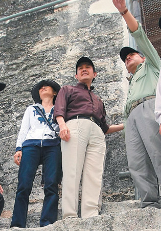 中新网6月1日电 据台湾《联合报》报道,马英九访问中美洲已经六天。马英九夫妇被安排参观危地马拉提卡尔公园的马雅遗址,轻松爬上数百阶的神庙,当团员问马英九“累不累?”没想到一旁的“酷酷嫂”周美青插话说“他什么都没做,怎么会累!”