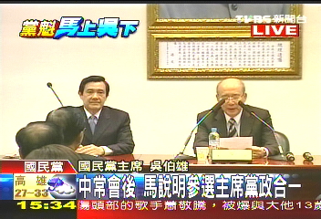 中新网6月10日电 据台湾媒体报道,中国国民党中常会10日下午通过第18次全体党员代表大会相关选举时程规划,会后,台湾当局领导人马英九和国民党主席吴伯雄举行联合记者会。马英九正式宣布,参选新一届中国国民党主席。