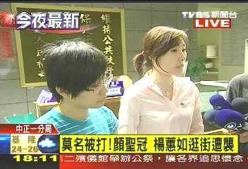 报道称,一名年约30岁的女子突然拉扯颜圣冠的马尾,杨蕙如上前制止时,遭到抓伤,2人随即到仁爱医院验伤,幸好只是轻伤,不过都受到惊吓,到警察局制作笔录。