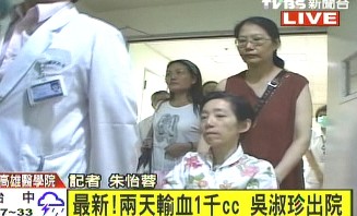中新网7月10日电 据台湾TVBS报道,陈水扁夫人吴淑珍9日因痔疮出血,失血过多导致低血压,送医急救,医院两天内帮她输血1000毫升,并与施打铁剂,身体好转,吴淑珍10日下午出院。