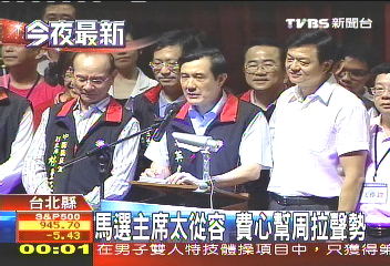 中新网7月22日电 据台湾TVBS报道,马英九参选国民党主席,21日晚在台北县开讲,马英九花了相当大篇幅赞扬县长周锡玮,还调侃民进党明年参选新北市呼声很高的苏贞昌,让这场政见会,看起来反而像准主席拉抬周锡玮的辅选大会。