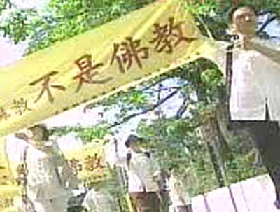 来自台北的“正觉佛教基金会”成员在高雄巨蛋外举着布条和标语,高喊“(达赖喇嘛)不是和平者、否定正法、死后必下地狱”等口号。