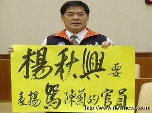 刘德林在议事厅中高举海报,要求“杨秋兴公开表扬讲出灾民心声的这位县府官员”,刘德林表示,88风灾重创高县,百姓丧失性命、家园尽毁,台湾的宗教界在灾变的第一时间,出钱出力收容协助灾民度过难关,宗教博爱的情怀令人动容。