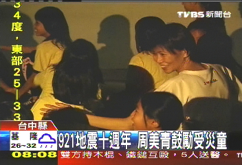 中新网9月8日电 据台湾TVBS报道,台湾921地震十周年,马英九夫人周美青,7日下午以“周老师”的身份,陪当年的灾童看纪录片。