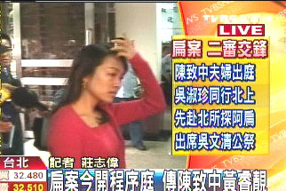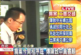 中新网10月30日电 据台湾TVBS报道,台湾高等法院审理扁家弊案,今天(30日)首度传唤陈致中和黄睿靓出庭,对于媒体询问只回答“谢谢”两字,就快步进入法庭。