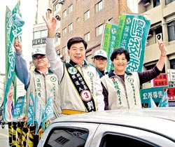 国民党桃园县长候选人吴志扬,昨日把重心放在桃园、芦竹等地,尽管飘著细雨,仍不减支持者的热情,在力行市场内一一与摊商和菜篮族握手拜票,又与“立委”周守训、多位国民党中常委,桃园市长候选人苏家明、多位县议员候选人,骑乘自行车向选民拜票。