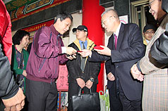 吴敦义在拈香祝祷期间,在大佛风景区内的大雄宝殿广场旁亲自种下菩提树,并发放888个福袋给前来游玩的民众。