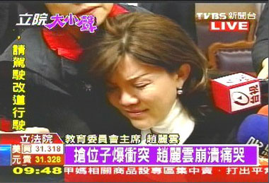 而上个星期才因为冲突昏倒送医的“主席”赵丽云,26日再度看到这样混乱场面,一度痛哭。“教育委员会主席”赵丽云:“我们要开会,我们要按规则开会,请所有的不管那个党派的,要对得起人民,我们是拿薪水来开会,不是来打架的。”