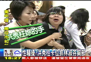 据台湾TVBS报道,国民党“立委”洪秀柱跟民进党“立委”林淑芬,为了抢发言台的位置,洪秀柱从后方抓林淑芬,不偏不倚刚好抓住林淑芬的胸部,后来为了卡位,洪秀柱的头,又卡在男性“立委”苏震清的胯下。
