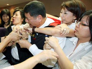 就在张庆忠宣布休息片刻后,国民党“立委”杨琼璎、陈淑慧、罗淑蕾等人站上主席台,与民进党“立委”林淑芬等人对峙,张庆忠则在国民党“立委”林益世等人团团包围下重新站上主席台,宣布继续开会,并由议事人员完成法案逐条宣读。