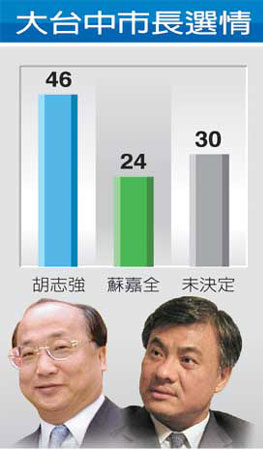中新网6月4日电 据台湾《联合报》报道,台中市接连发生重大治安和警纪案件,《联合报》对大台中市长最新选情调查发现,胡志强目前虽以46%支持率领先苏嘉全22%。