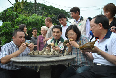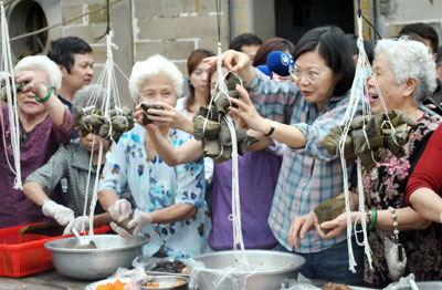 中新网6月13日电 据“中央社”报道,民进党新北市长参选人蔡英文13日到台北县贡寮乡三合院与婆婆妈妈一起包粽子,第1次包粽子的她在旁人协助下,包了3个。她说,包粽子最困难是“把它(指粽子)合起来”。