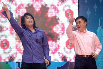 中新网5月19日电 据“中央社”报道,台北市将举办花卉博览会,艺人伍佰19日身披纸制环保“太空战警装”化身“i花博”环保亲善大使,与台北市长郝龙斌大跳招牌花朵舞。伍佰高唱“你是我的花博”,强调爱地球、做环保,要“不眠也不休”。