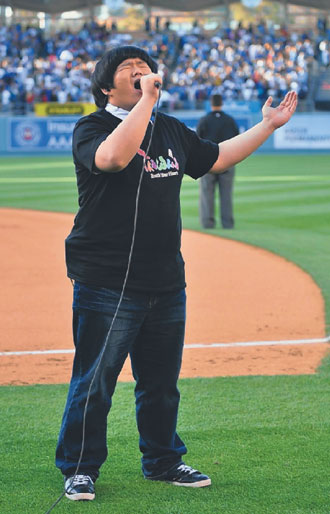 中新网5月24日电 据台湾媒体报道,被称为台版“苏珊大妈”的台湾之光“小胖”林育群22日在“道奇台湾日”上,献唱3首歌,以动人美声获得现场近6万民众热烈掌声。林育群表演后表示,虽然手脚还在发抖,但收获良多。