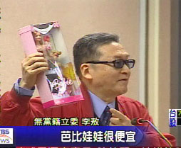 而今日再度出现在“立法院国防委员会”,李敖还是要想尽办法挡军购案。李敖当众拿出芭比娃娃并指出,“我的秘密武器,不要怕,今天是非常温柔的芭比娃娃,芭比娃娃很便宜,可是买了以后可麻烦了,她要换衣服,有女朋友,她女朋友还有男朋友,她男朋友还是美男子,买来买去买个没完没了。”