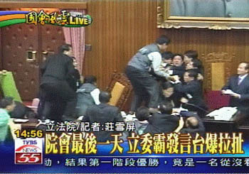 据悉,自19日下午开始的此次“院会”议程,因朝野对“中选会组织法”草案僵持不下并爆发严重肢体冲突,致议事空转,连带影响2007年度当局总预算案无法通过。“立法院长”王金平更在主持“议事”时,在冲突中遭书本砸到嘴唇红肿,会场后方的大门亦遭人用摩托车锁封闭。