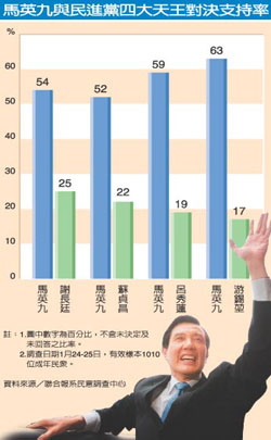 而民进党若推派吕秀莲或游锡堃和马英九对决,落后差距扩大,马分别获得59%与63%支持,挺吕及挺游民众约为18%。