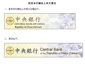 中新网2月11日电 台“中央银行”10日也搭上“正名”列车,“央行”宣布,“中央银行”网站上的英文名称,自10日起将原本是CENTRAL BANK of CHINA[后附Republic of China(Taiwan)],改成CENTRAL BANK of the Republic of China(Taiwan)。