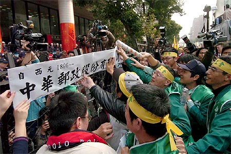 中新网2月13日电 台湾的“中华邮政公司”12日改名台湾邮政公司,工会发动会员抗议,在揭牌仪式后,将“中华邮政”的牌子重新挂在铁丝网上,凸显员工心声未受重视。