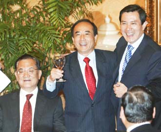 在连战带领下,与会者干了一杯红酒,王马两人为示没有心结,将手中红酒彼此混合,在众人“交杯酒”的呼声中,同时干杯,现场欢声雷动。