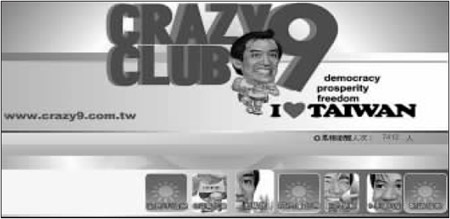 “阿九”的招牌已经迅速风靡到了网上,有群“马迷”特别创建了一个名为“疯狂阿九俱乐部”的网站(.tw)。首页上,漫画造型的马英九穿着蓝色短裤慢跑,边跑边眨眼,比真实的马英九还要俏皮。网站开设了“阿九疯台湾”“拍马屁”“阿九情报”等栏目,还制作了不少讽刺绿营的动画,令人忍俊不禁。现实生活中的马英九闽南语不太灵光,但在网站上却可以用一副标准的闽南腔调侃陈水扁。
