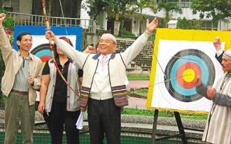 苏贞昌下午还在秀林乡三栈部落试射传统弓箭,前两箭射得不理想,第三箭正中靶心。得到“勇士服”后,苏贞昌还与现场原住民高呼“雅固斯诺尼.固”(“勇士”之意)。
